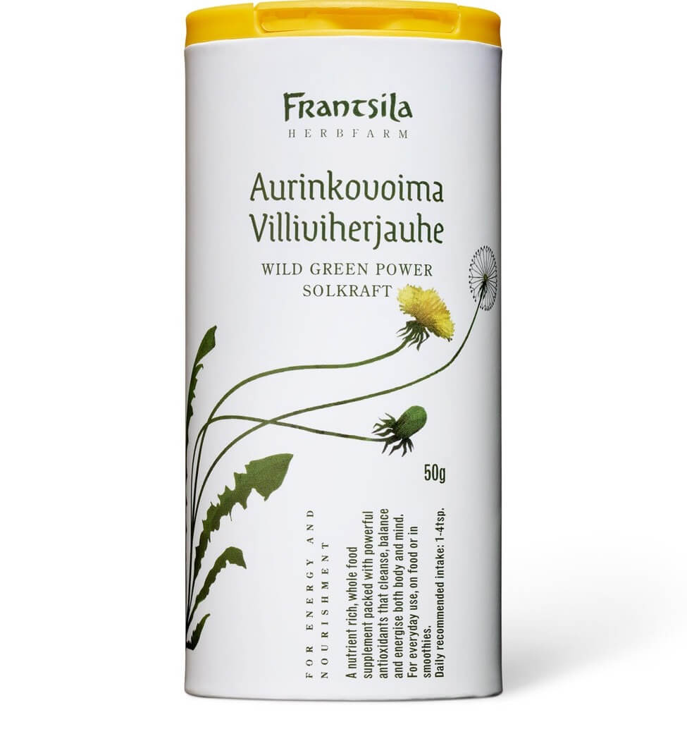 Aurinkovoiman luomuviljellyt raaka-aineet: nokkonen, sinimailailanen, porkkanan lehti, mäkimeirami, persilja, siankärsämönsen lehti, liperi, voikukan lehti ja pihatähtimö toimivat suojaravinteina ja antioksidantteina.